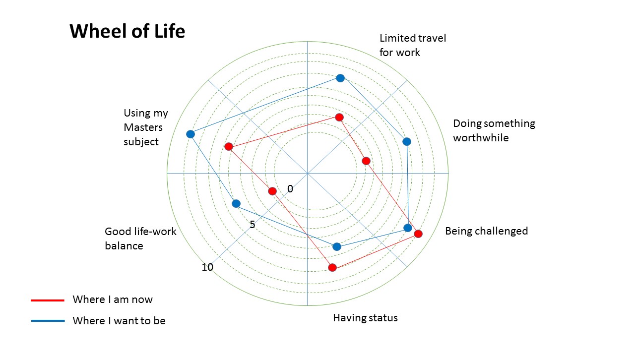 Draw your own Wheel of Life. For each factor that is significant for you, plot on the wheel from 1 – 10 (where 1 is low and 10 is high) how far you are expending energy current role (as a student or as an employee) is satisfying these needs. Then do it again to show where you would like the relative levels to be for each factor. Remember that sometimes you need to make choices in a career so choosing 10 for each of your key factors is probably not going to be realistic; you need to consider how important each factor is and where you are willing to compromise. Once you have a visual representation of this you should start to see where you would like to make changes in your life / career. Then it’s up to you to consider how you can make those changes!